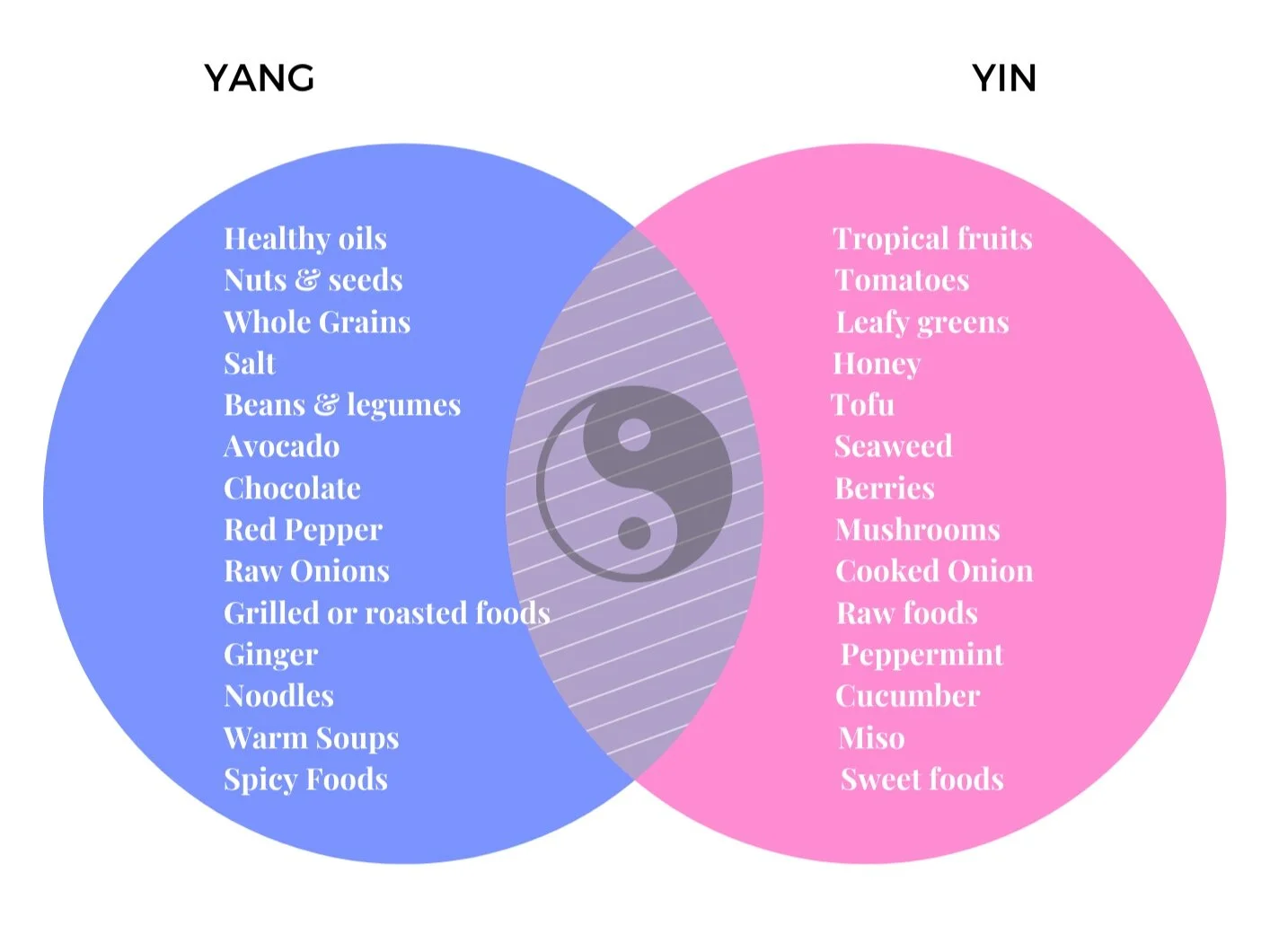 This same concept can be applied to foods. Yin/yang is a Chinese concept demonstrating similar traits. Yin at its extreme is the divine feminine and yang at its extreme is as masculine as you can get! So how does this correlate with foods. Yang extreme foods would be deep fried and spicy while extreme yin foods would be sugar or alcohol. Think Yang/Heating and Yin/Cooling. Cooked foods versus raw foods. If you found that you tended strongly towards masculine in the chart, you may want to balance that out with cold salad or tropical fruits. If you leaned on the feminine side roasted root veggies with whole grains might help you feel more centered. Check out the chart below for some yin/yang food suggestions!